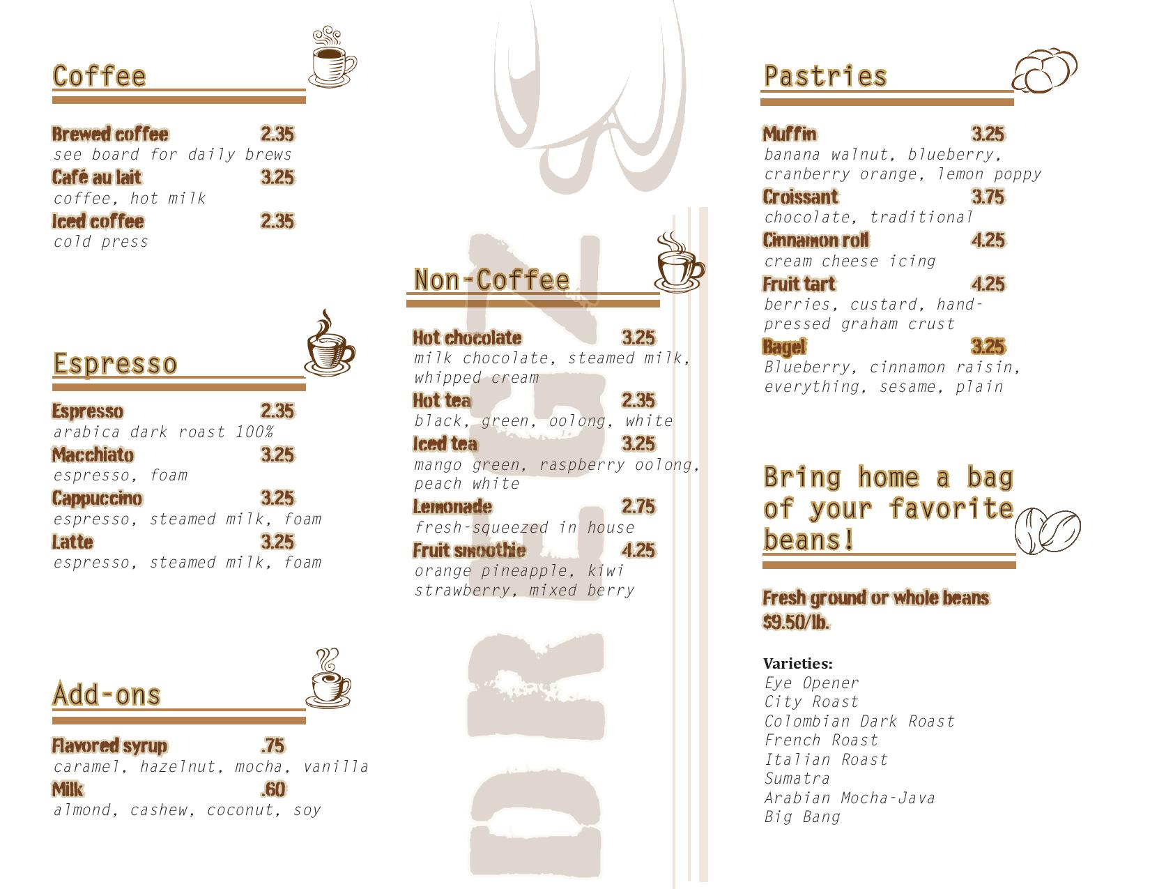 These pieces were created for a fictional coffee shop to showcase my design and content creation skills. A limited modern color scheme and a bit of copy to tell the story of the shop to the customer creates a cohesive message and theming throughout all media.